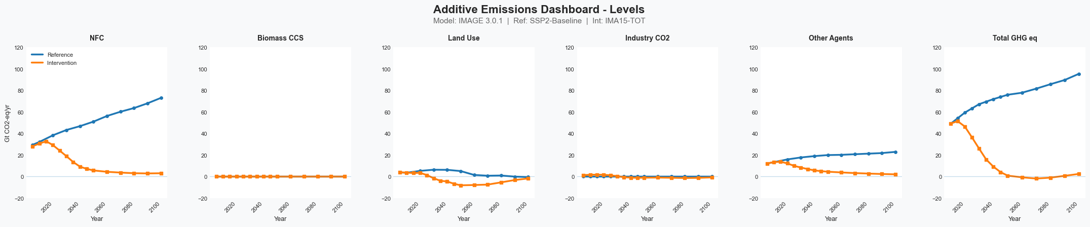 The third dashboard summarizes our "fully expanded decomposition", which includes the energy sector results in one pane, along with additive results for biomass CCS, land use, industrial process carbon dioxide emissions, and emissions of other gases than CO2 (other agents). The intervention scenario in this case has no biomass CCS and little change in industrial process emissions.