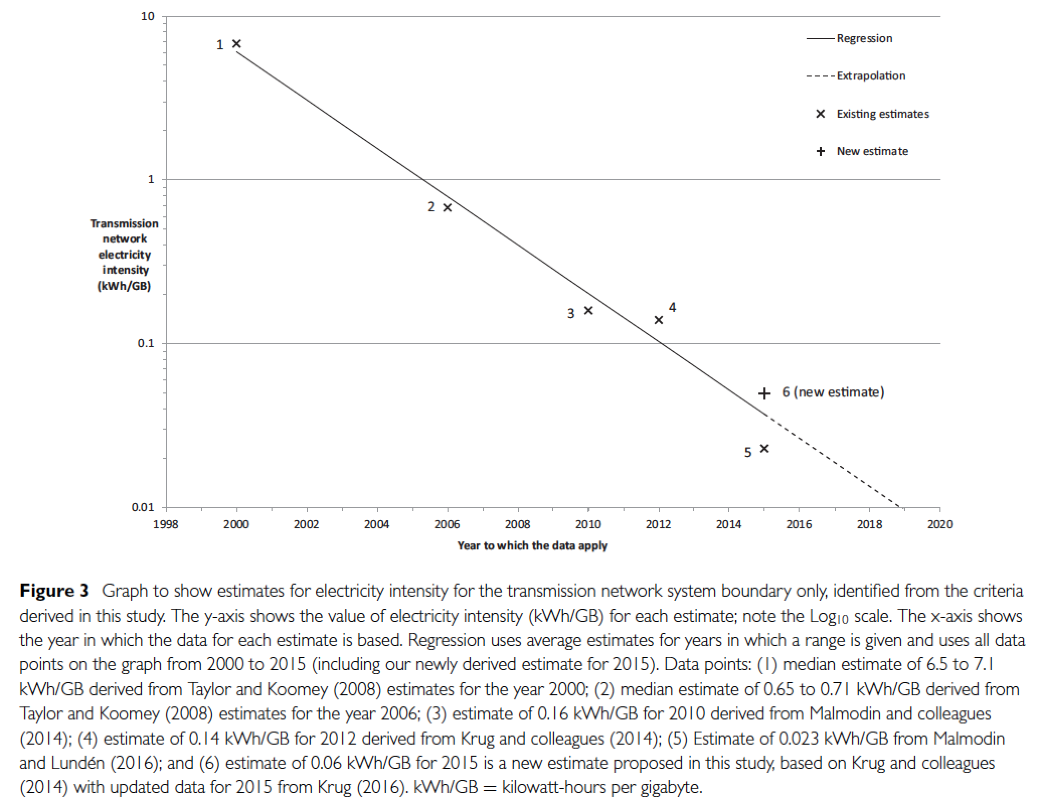 Unlike that for computing devices, the literature on the electricity intensity and efficiency of network data flows has been rife with inconsistent comparisons, unjustified assumptions, and a general lack of transparency. Our attempt to remedy these failings was just published in the Journal of Industrial Ecology in August 2017 (Aslan et al. 2017). The focus is on the electricity intensity of data transfers over the core network and the access networks (like DSL and cable).