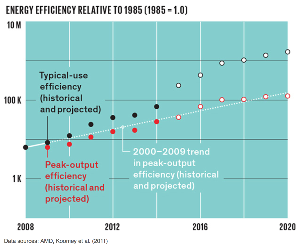 The graph posted above summarizes the main story, which is that peak output efficiency, which doubled every 2.7 years after 2000, is expected to continue on that pace through 2020, based on the AMD processor roadmap. The metric we call “typical-use efficiency”, on the other hand, which takes account of ever lower standby power modes, should see a faster rate of improvement. From 2008 to 2020 the rate of change in typical-use efficiency (according to AMD data) will result in about a doubling of efficiency every 1.5 years, which is similar to that for peak output efficiency in the half century preceding the year 2000.